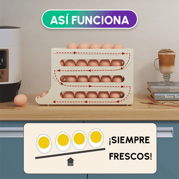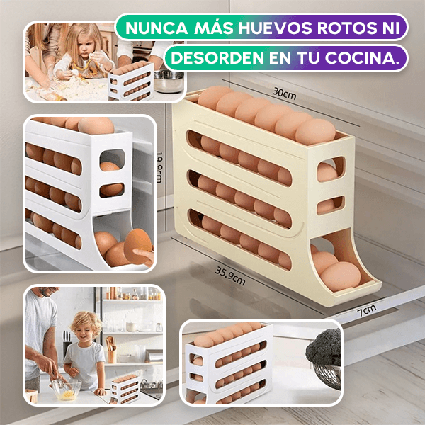 Olvídate del desorden y de los accidentes. Este innovador soporte con desplazamiento automático mantendrá tus huevos siempre frescos y perfectamente organizados, liberándote de preocupaciones. 🧼🥚