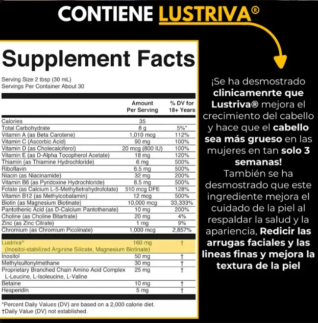 ✓ Resultados Probados: Crecimiento del cabello y mejora de la piel en 3 semanas. ✓ Ingredientes de Calidad: Biotina 40 veces más soluble y nutrientes esenciales. ✓ Fórmula Integral: Fortalece cabello, piel y uñas. ✓ Delicioso Sabor: Sabor a melocotón y mango, fácil de tomar. ✓ Apto para Todos: Vegano, sin gluten, lácteos, nueces ni azúcar.